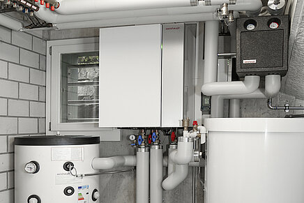 Das an der Wand aufgehängte, platzsparende Innengerät, welches sowohl für den Heiz- als auch für den Kühlbetrieb geeignet ist, beherbergt die Elektroanschlüsse, die Umwälzpumpe, sowie die Sensorik und die Steuerung des Systems. Neben einem 200-Liter-Pufferspeicher kommt als Trinkwasserspeicher der WAS 300 LE (Eco) zum Einsatz. All diese Geräte sind optimal aufeinander abgestimmt und arbeiten perfekt zusammen.