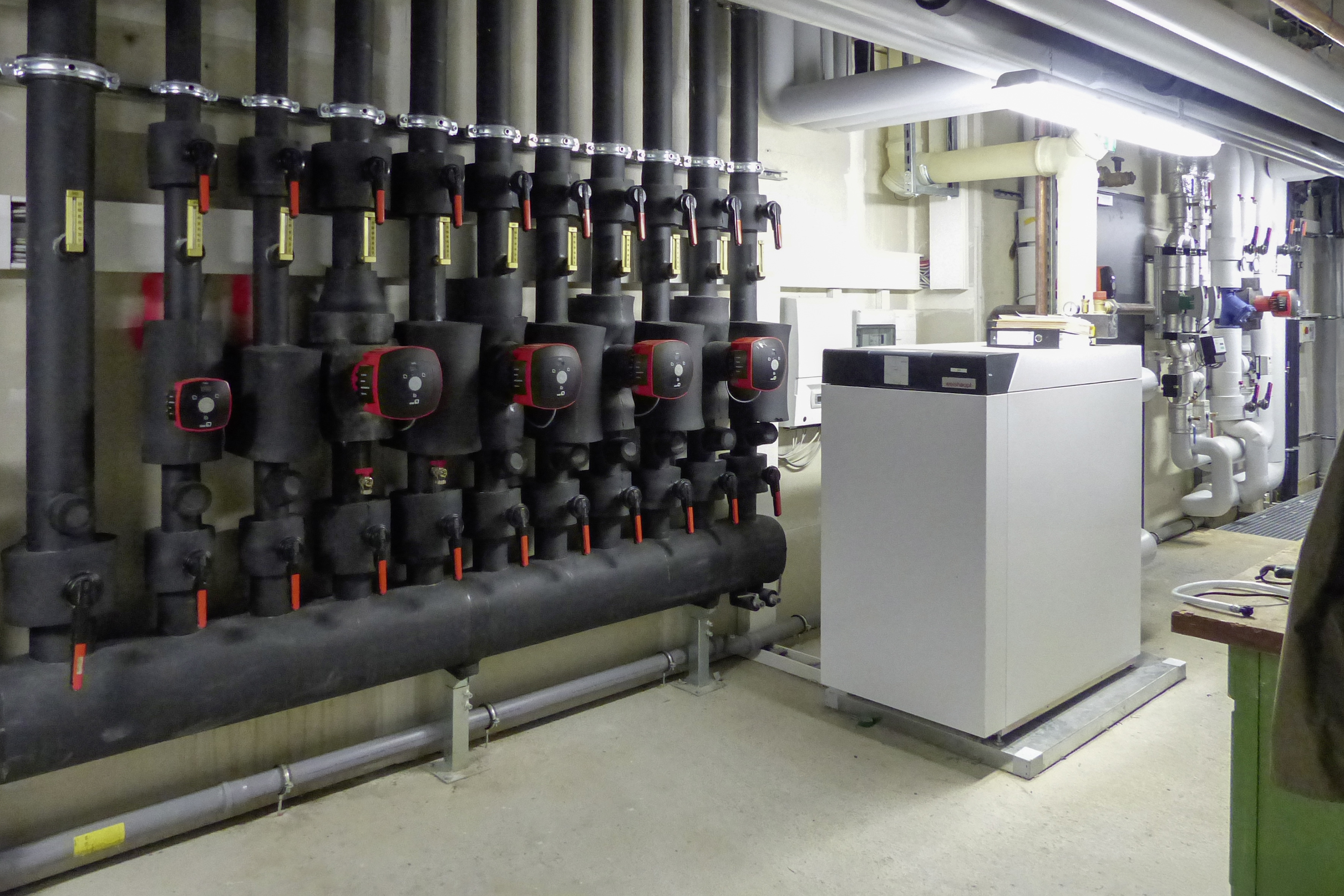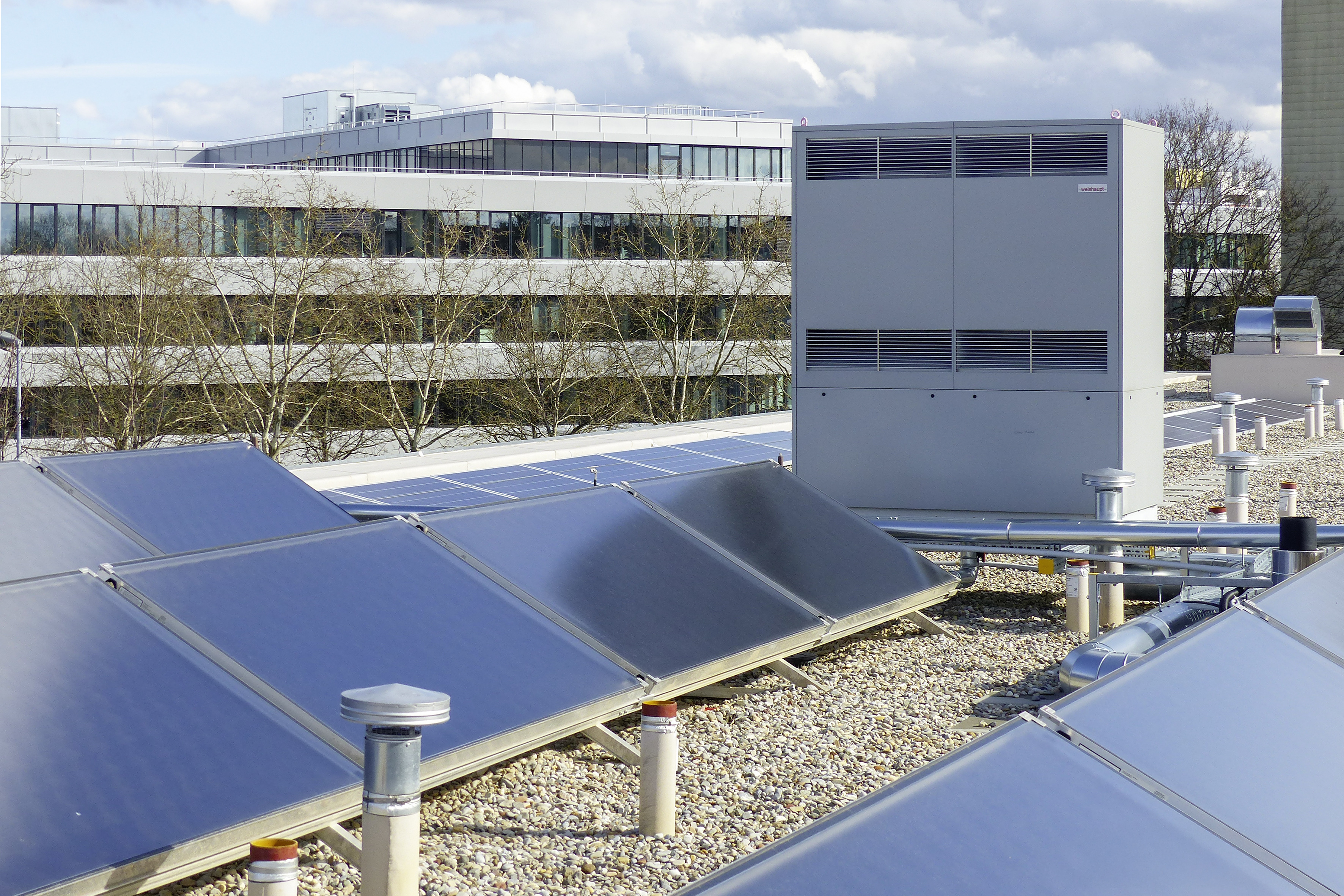 Un système hybride Weishaupt a été choisi pour le chauffage et la préparation d'eau chaude sanitaire de l'hôtel. Il se compose d'une pompe à chaleur air/eau WWP L 60 AD installée à l'extérieur, d'une chaudière à condensation au gaz Thermo Condens® WTC-GB 210 et de 18 capteurs solaires WTS-F2 reliés à deux stocks tampons de 3 000 litres.